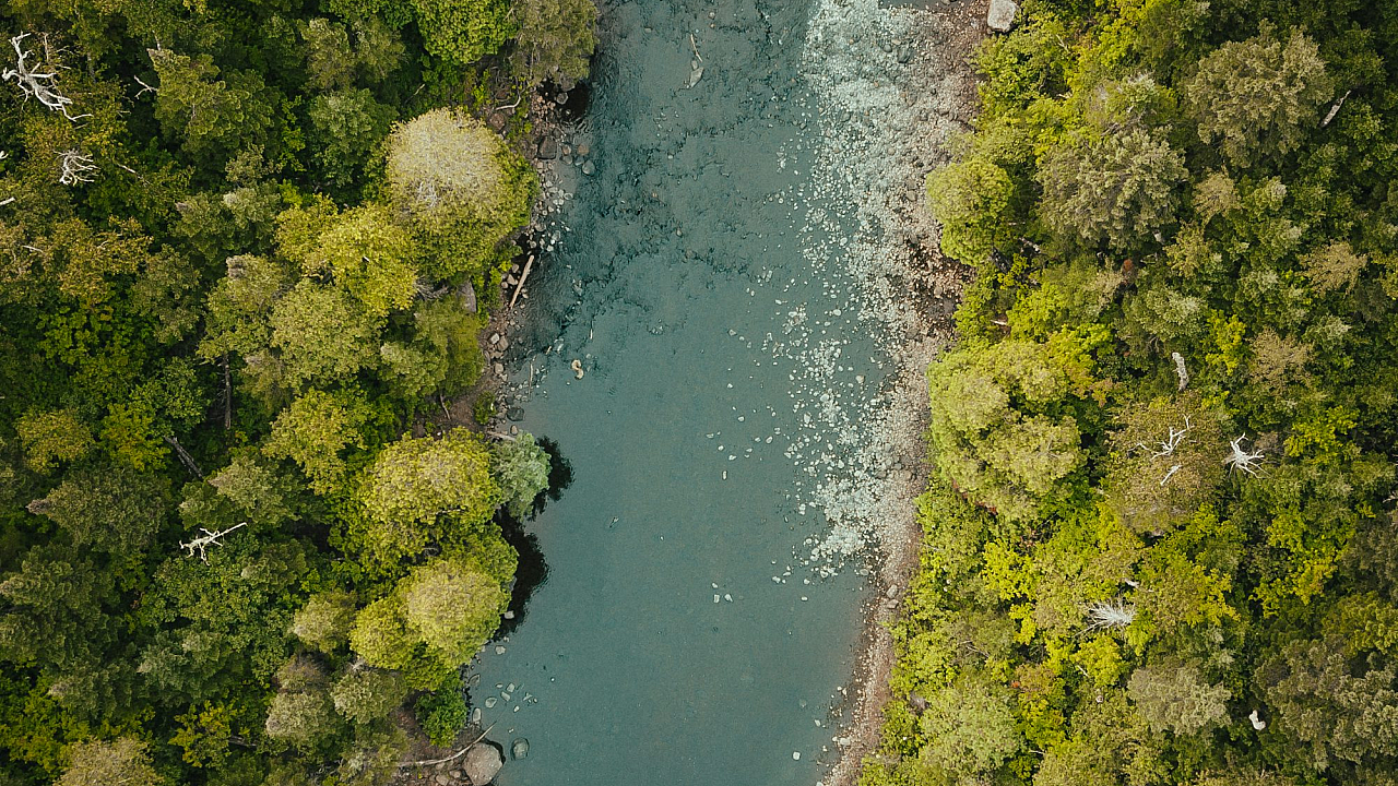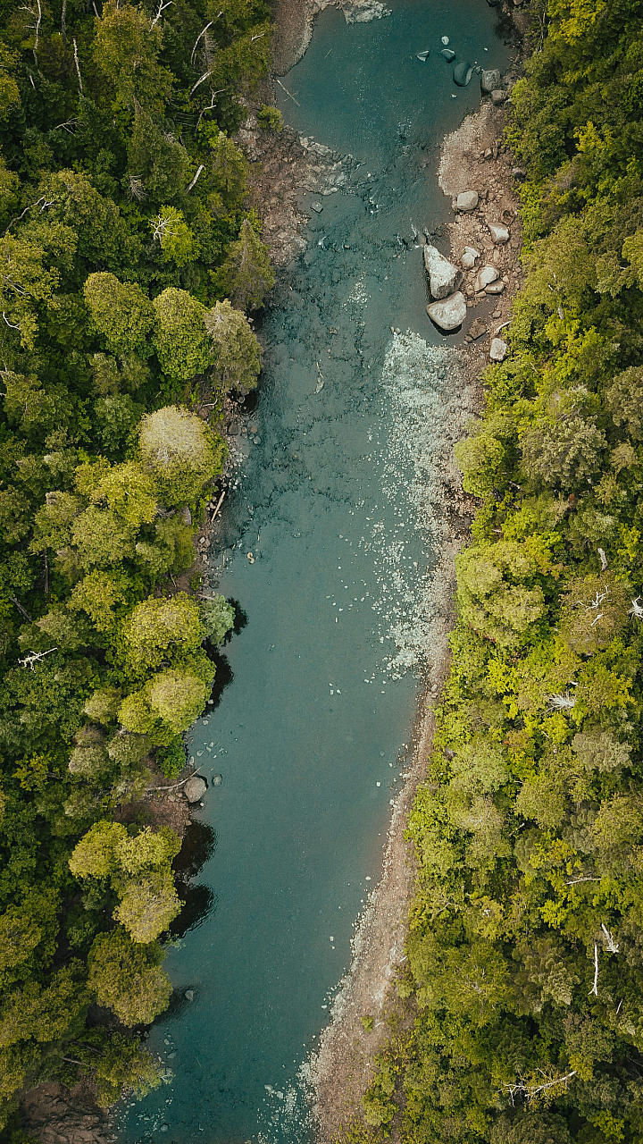 river, pine trees, top view, aerial view, overhead view, nature, landscape, scenery, water, forest, woods, trees, coniferous, green, scenic