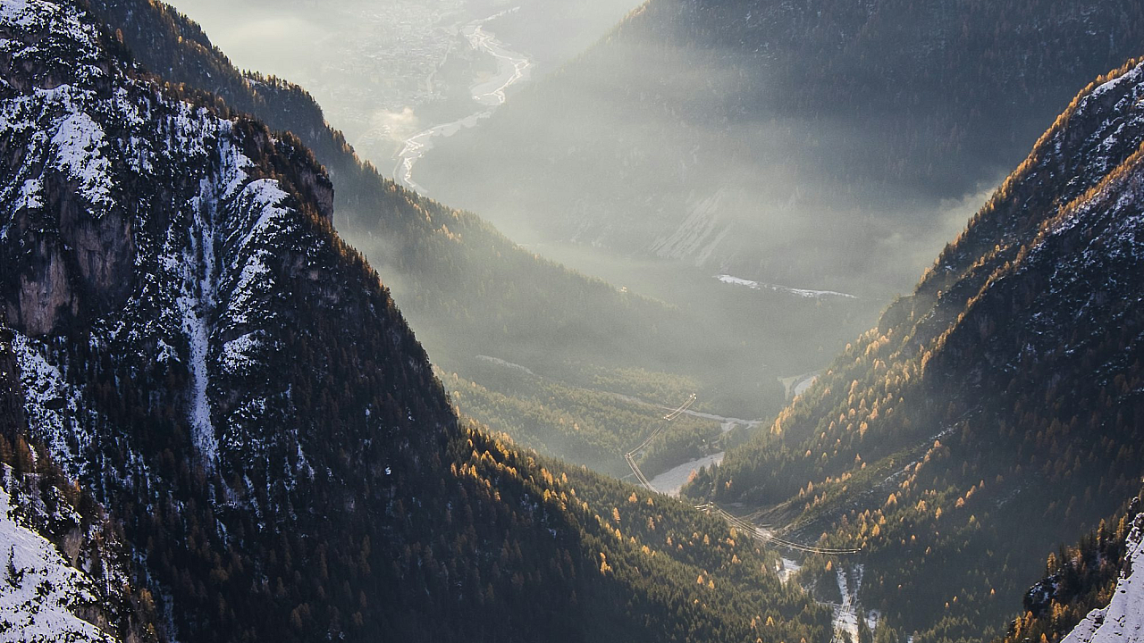 Wallpaper Tree-Covered Valley Between Snow-Capped Mountains Aerial Photo