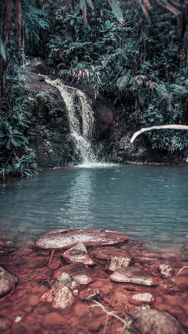 The vibrant greenery of the trees contrasts beautifully with the clear, flowing water of the waterfall. The image captures the natural beauty of a forest landscape, providing a calming and aesthetically pleasing visual experience. The rocks add texture and depth to the scene, enhancing the overall impact.