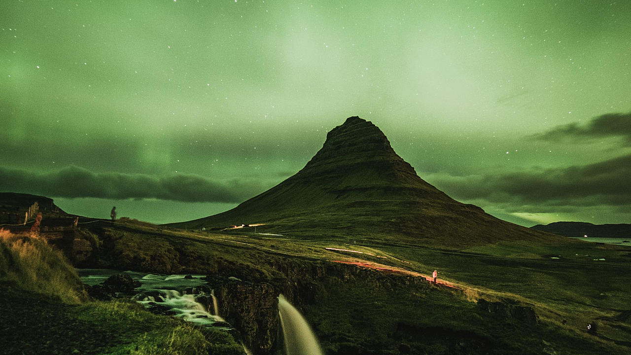Wallpaper Waterfalls Near Mountain Under Green Sky