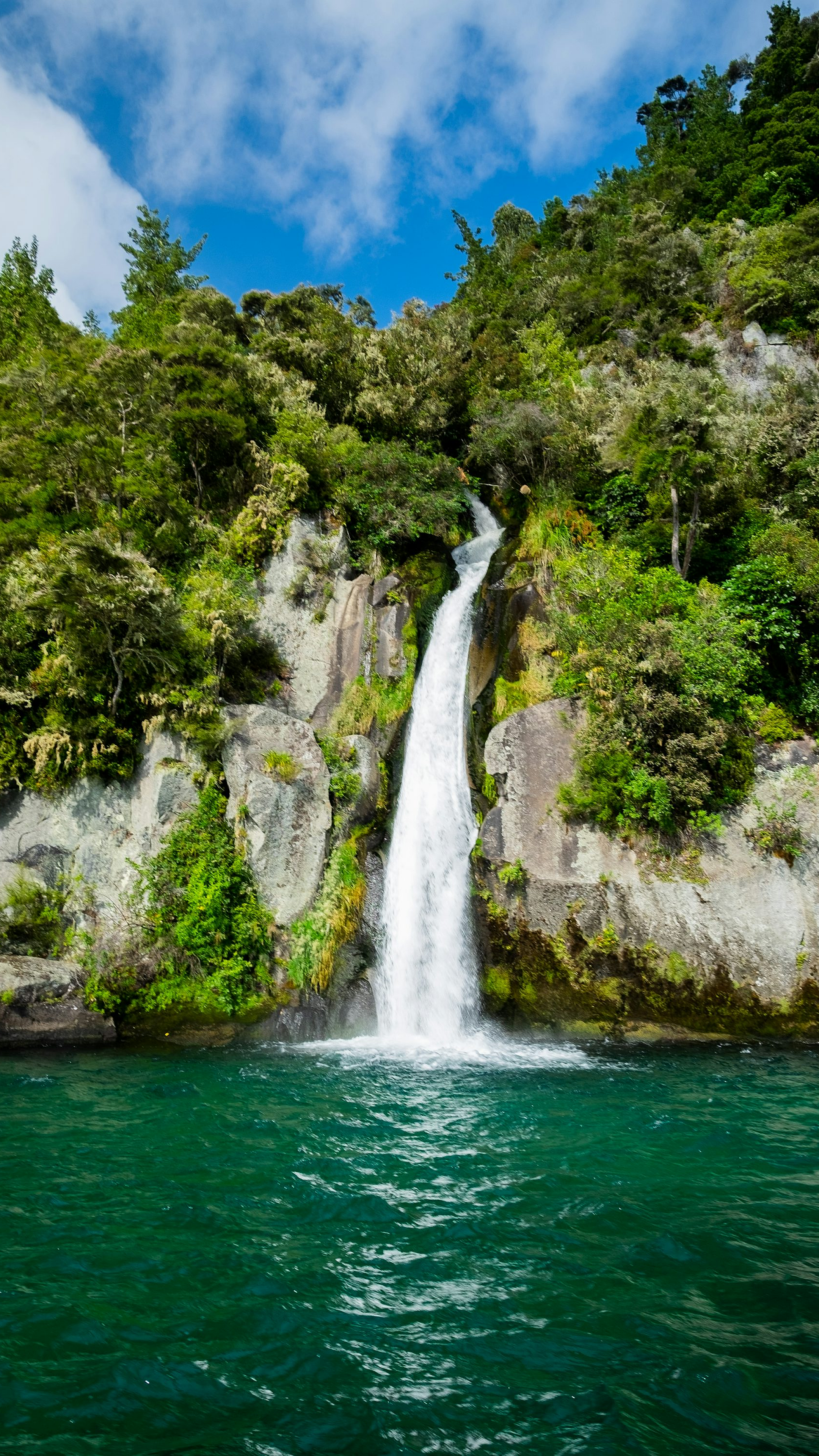 The deep greens of the trees and the bright white of the waterfall create a striking visual contrast. The overall composition is balanced and aesthetically pleasing, making it a perfect choice for a relaxing and inspiring wallpaper.