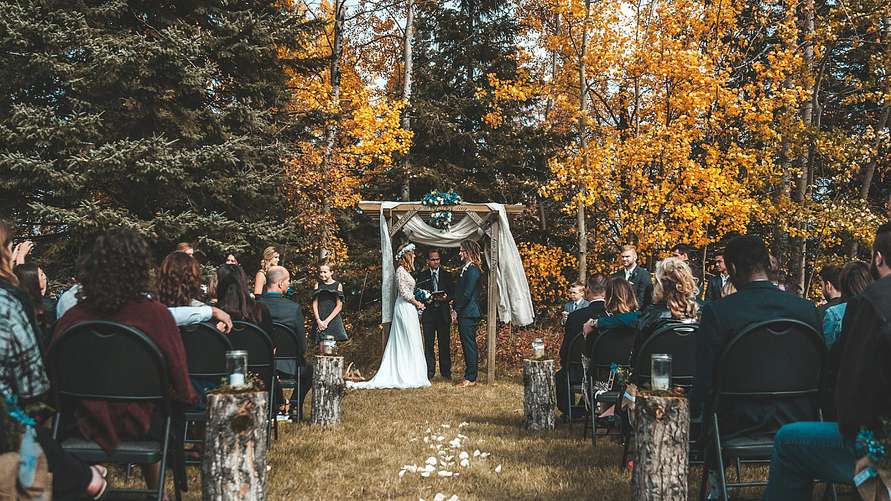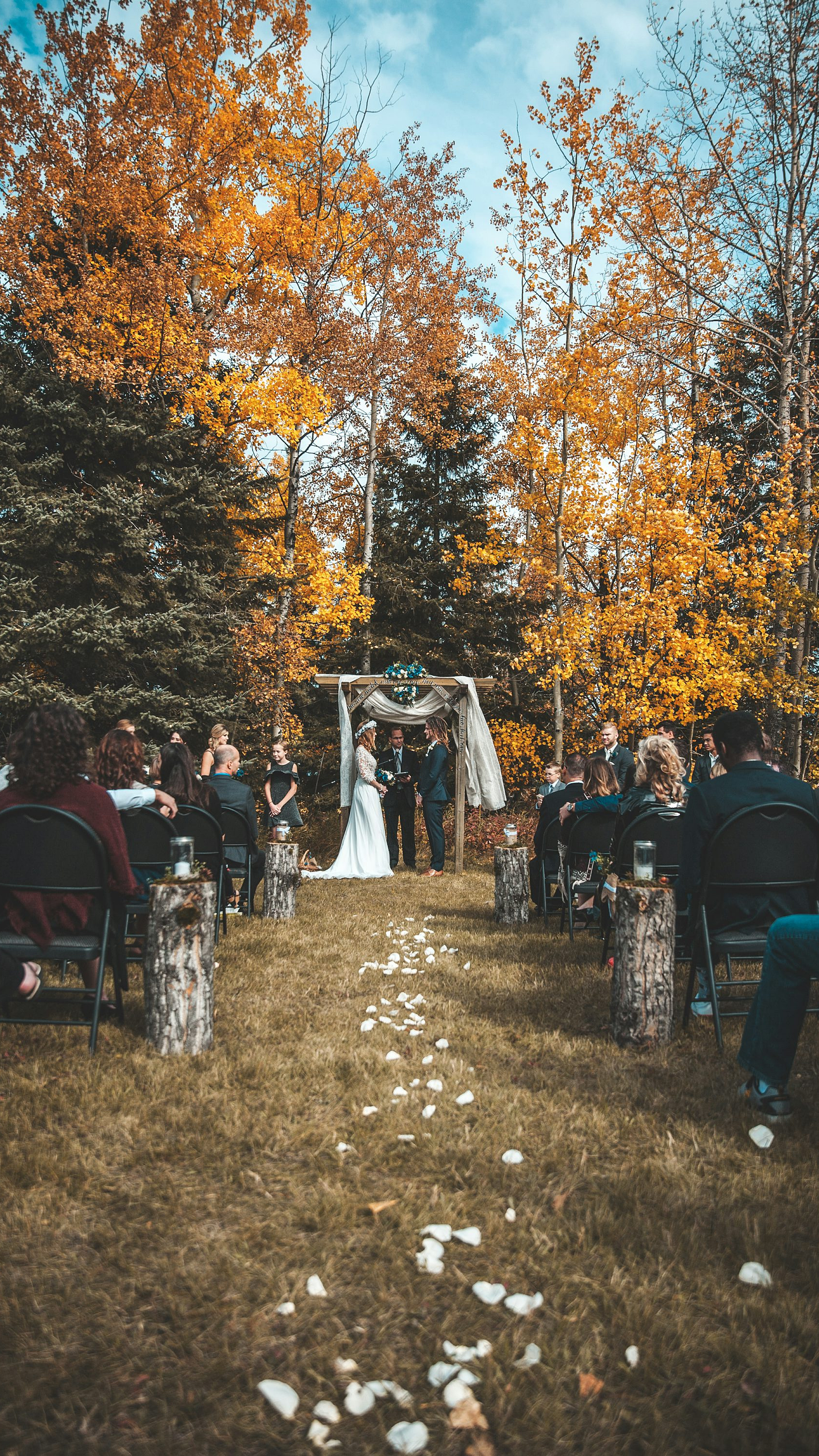 wedding, ceremony, fall, autumn, trees, daytime, leaves, foliage, golden, orange, red, marriage, nuptials, celebration, nature