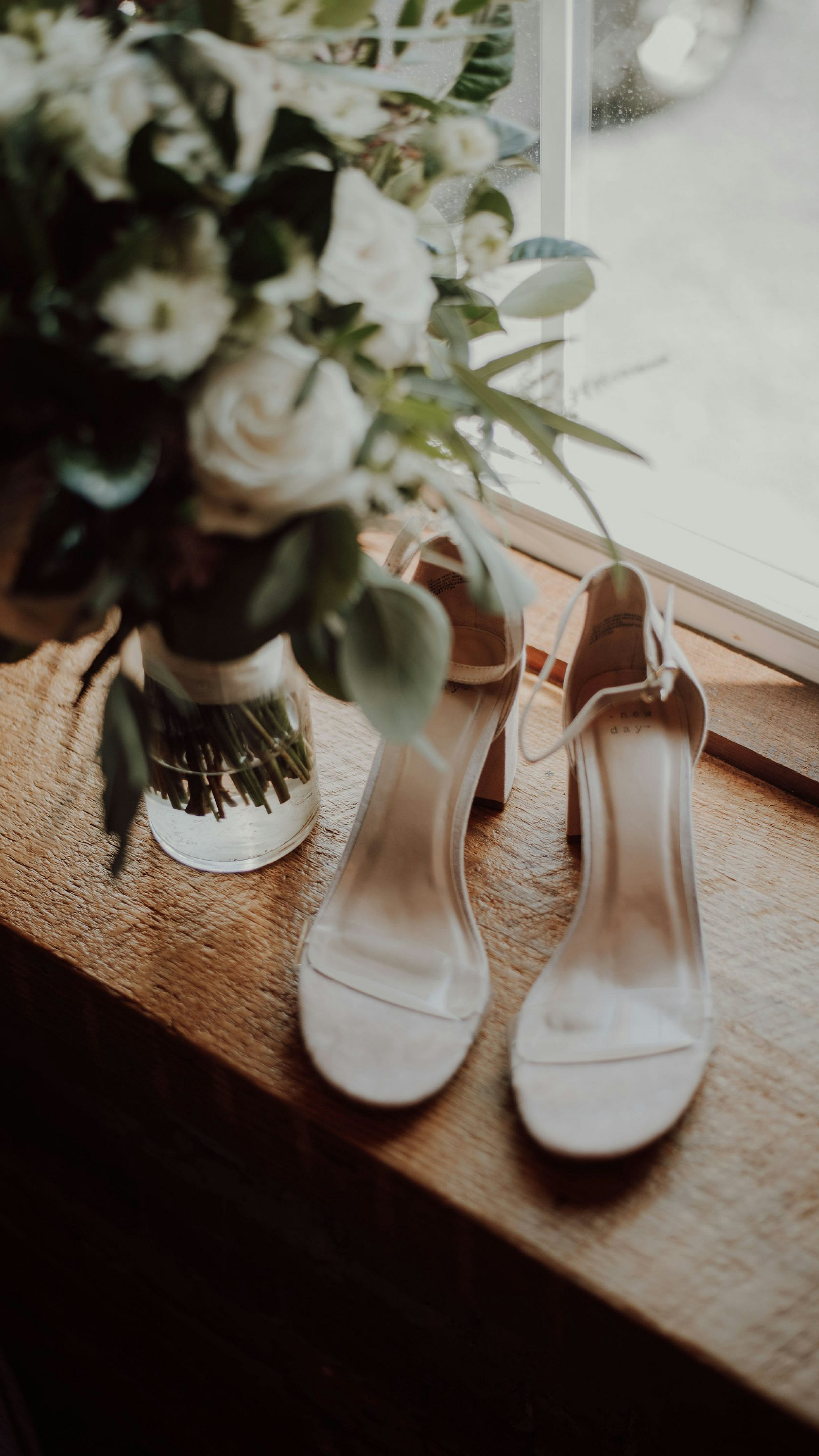 white heels, open-toe heels, ankle-strap heels, flower vase, floral arrangement, high heels, stilettos, white shoes, footwear, summer shoes, elegant shoes, minimalist wallpaper, fashion wallpaper, still life wallpaper, floral background