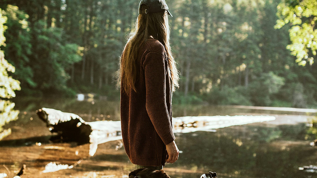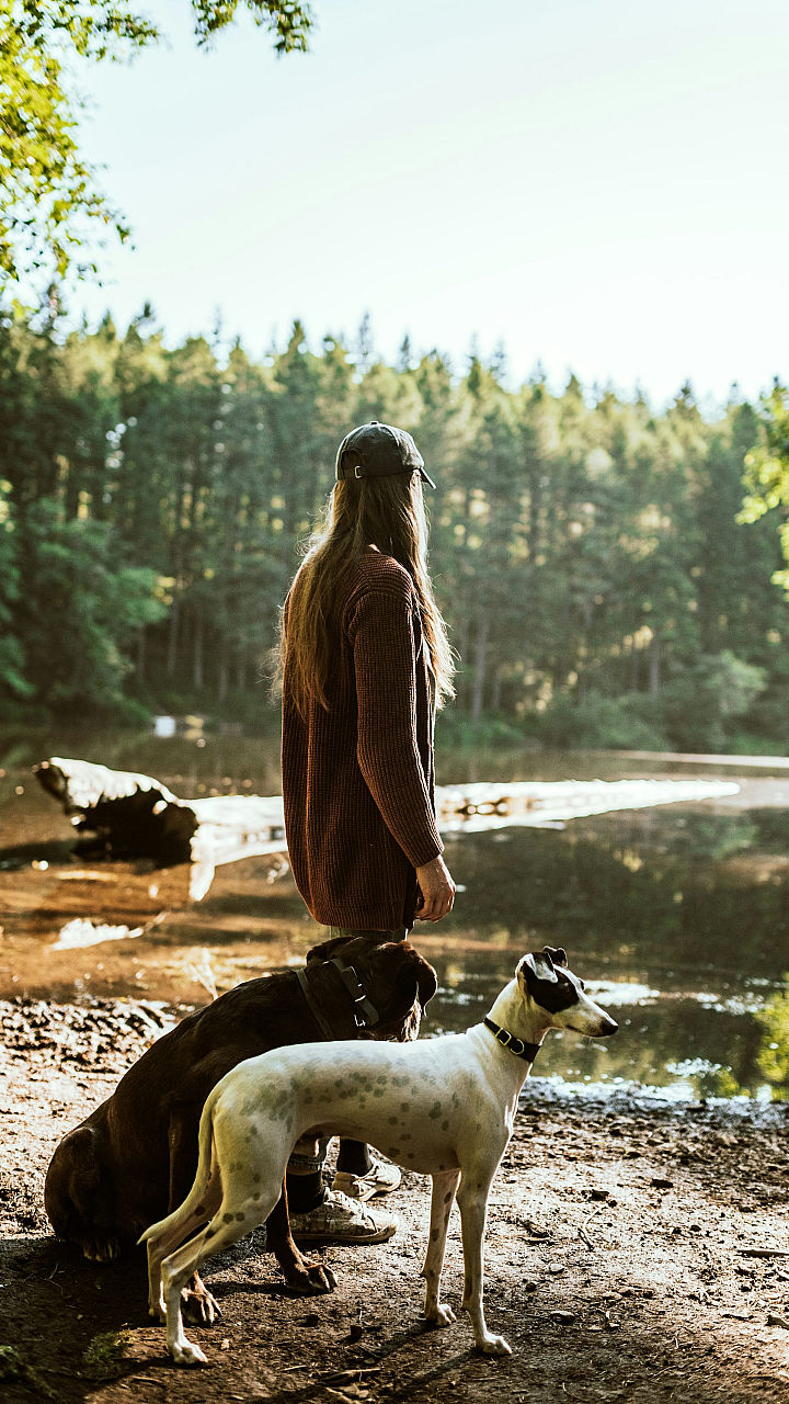 woman, dog, brown jacket, white dog, brown dog, short-coated dog, sitting, outdoors, daytime, pet, companion, animal, canine, portrait, friendship