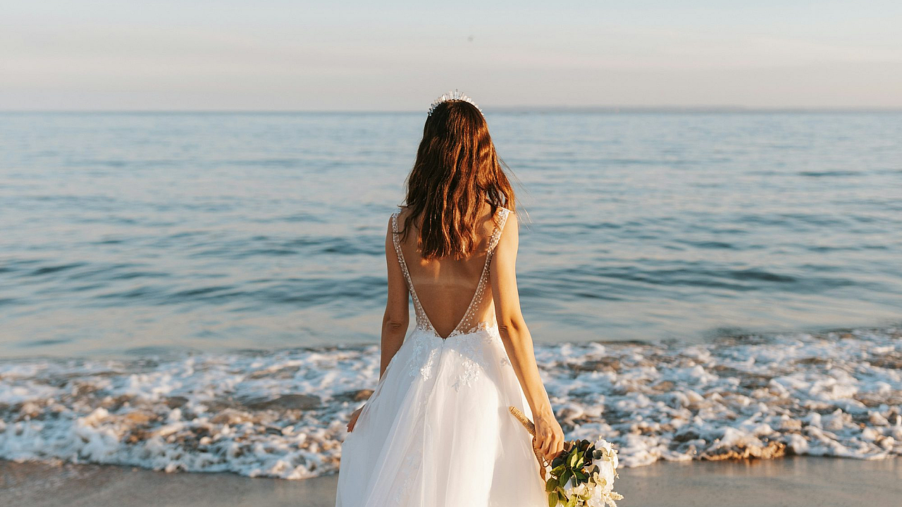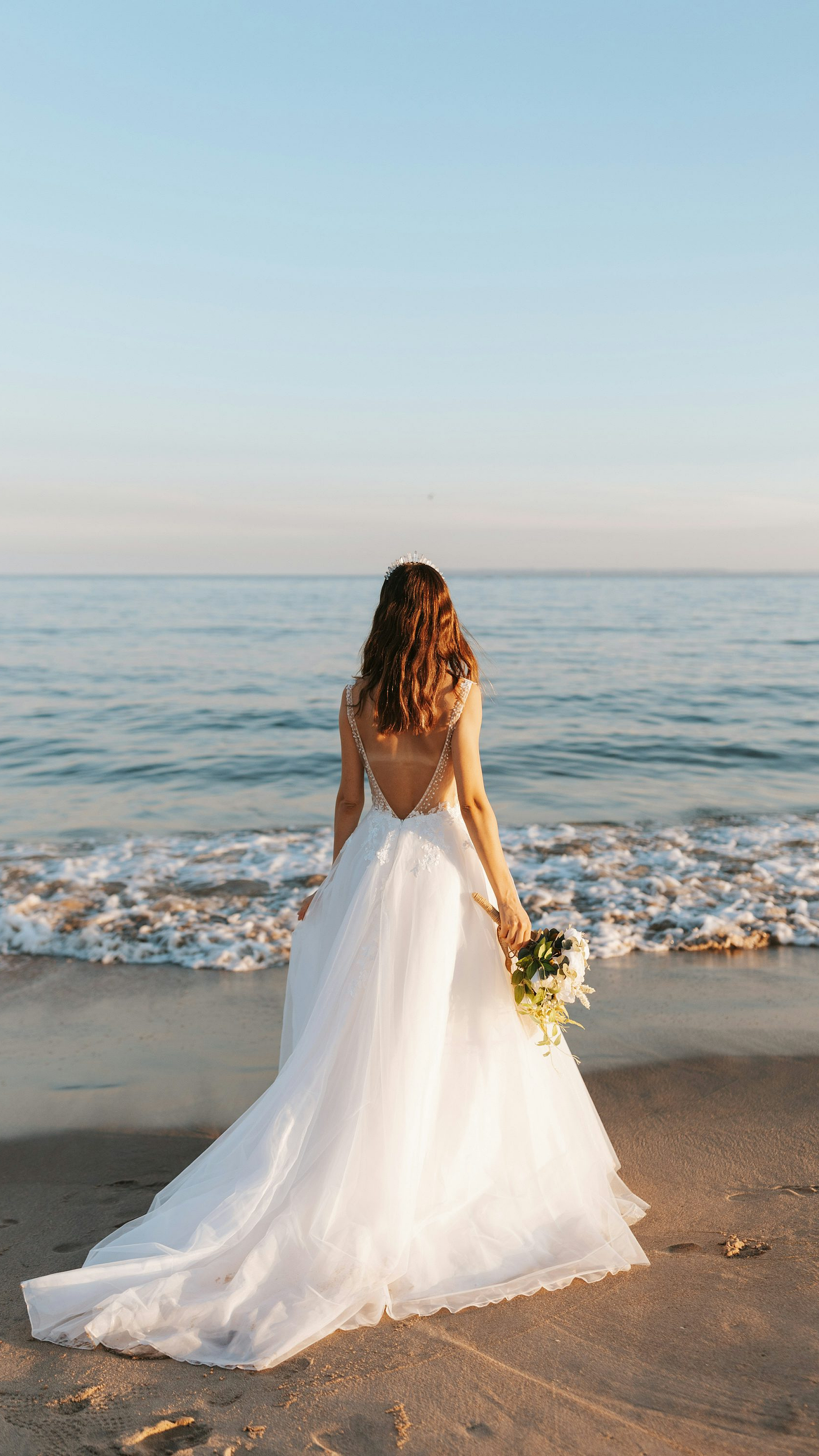 Keywords: woman, bride, wedding, dress, white dress, beach, ocean, seaside, daytime, sunlight, sand, barefoot, coastal, summer, marriage