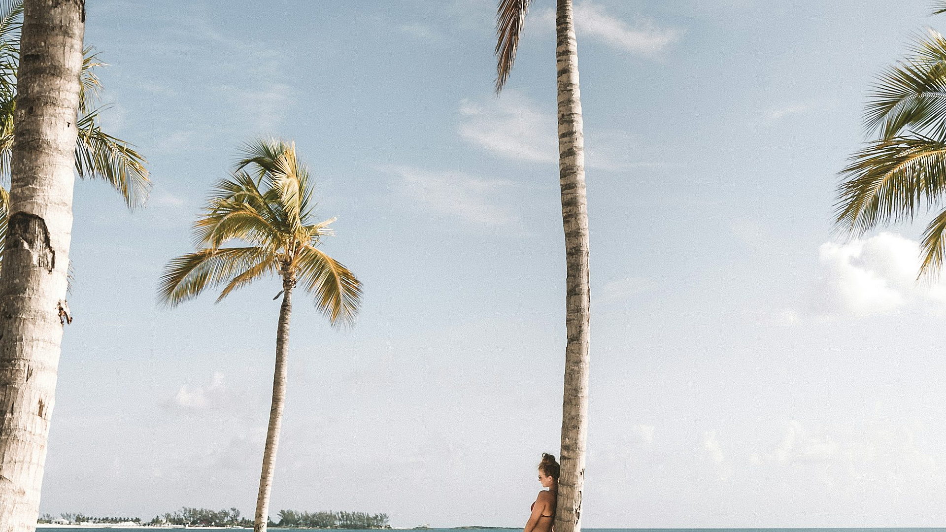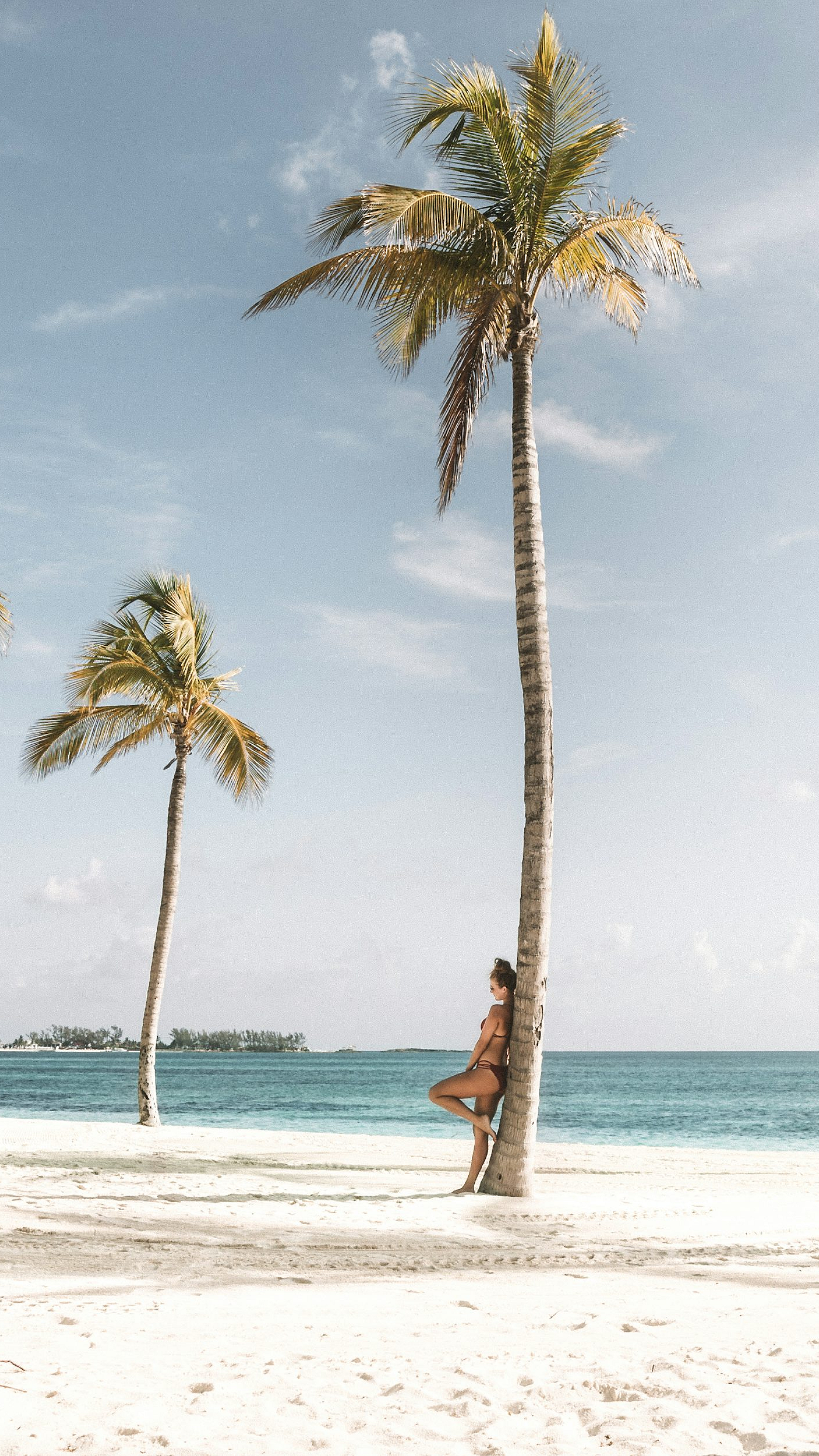 woman, leaning, tree, beach, ocean, sea, coast, seashore, shoreline, sand, relaxing, serene, calm, peaceful, nature