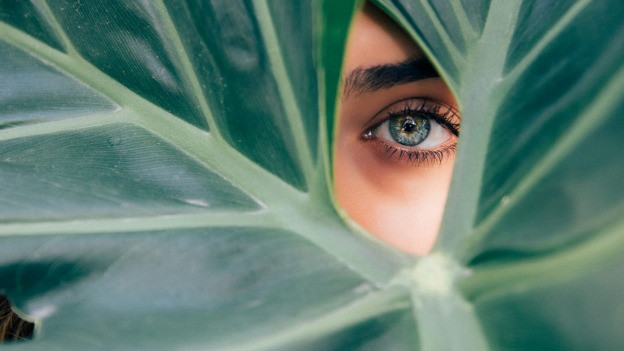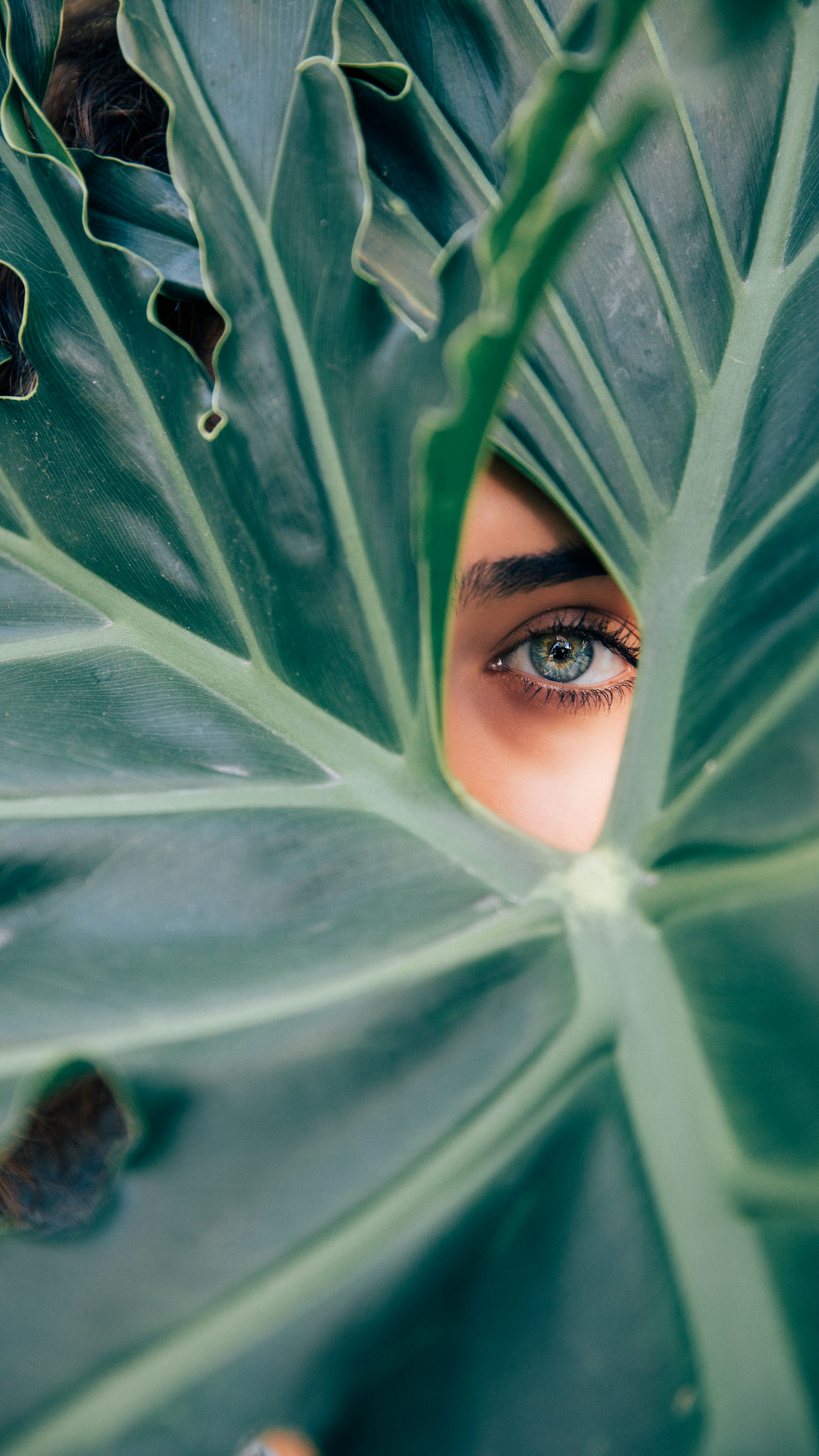 woman, peeking, green, leaf, plant, daytime, nature, foliage, leaves, looking, over, hidden, flora, vegetation, wallpaper