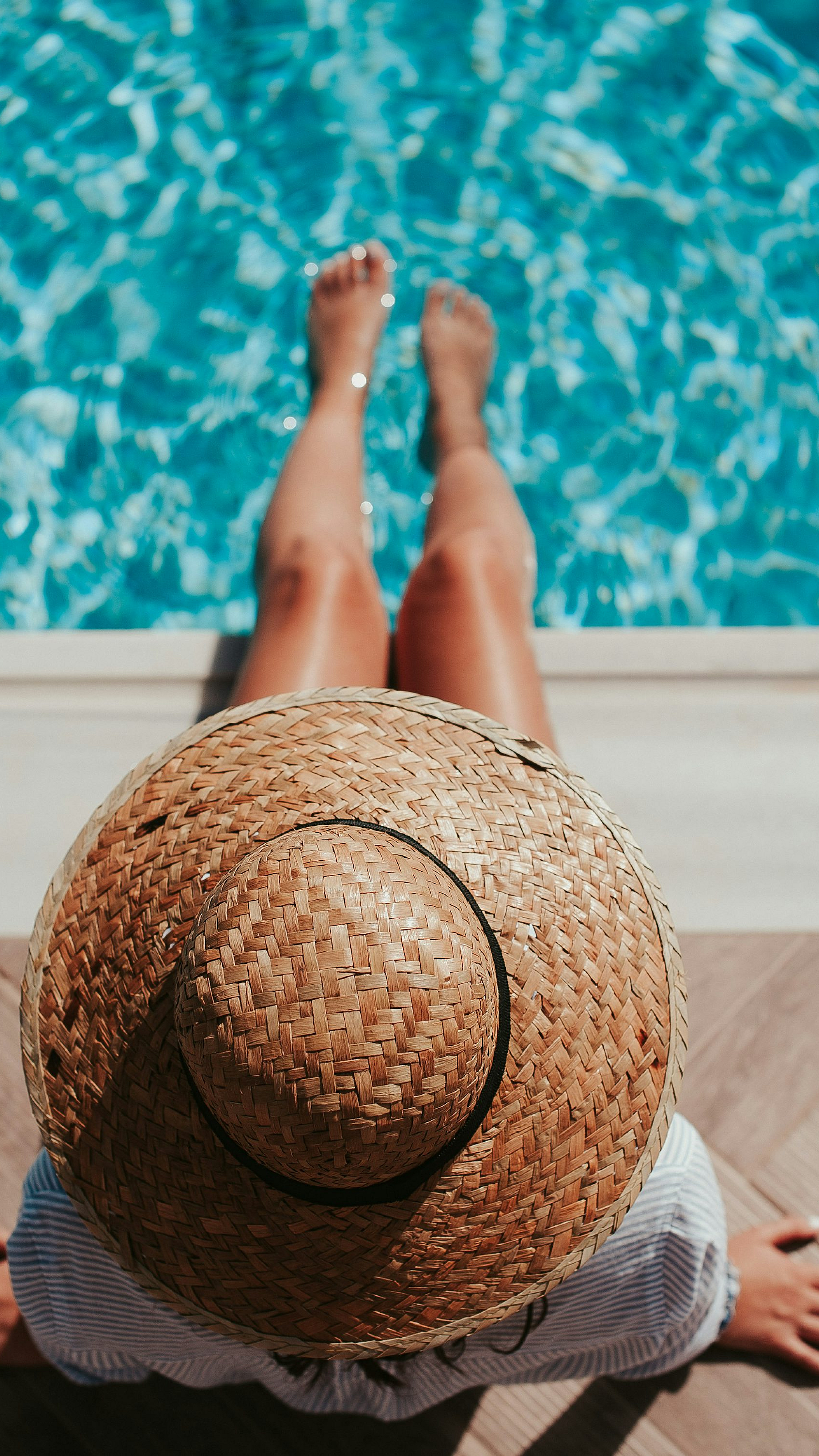 woman, sitting, poolside, pool, feet, water, relaxing, summer, vacation, holiday, sunbathing, leisure, calm, serene, tranquil