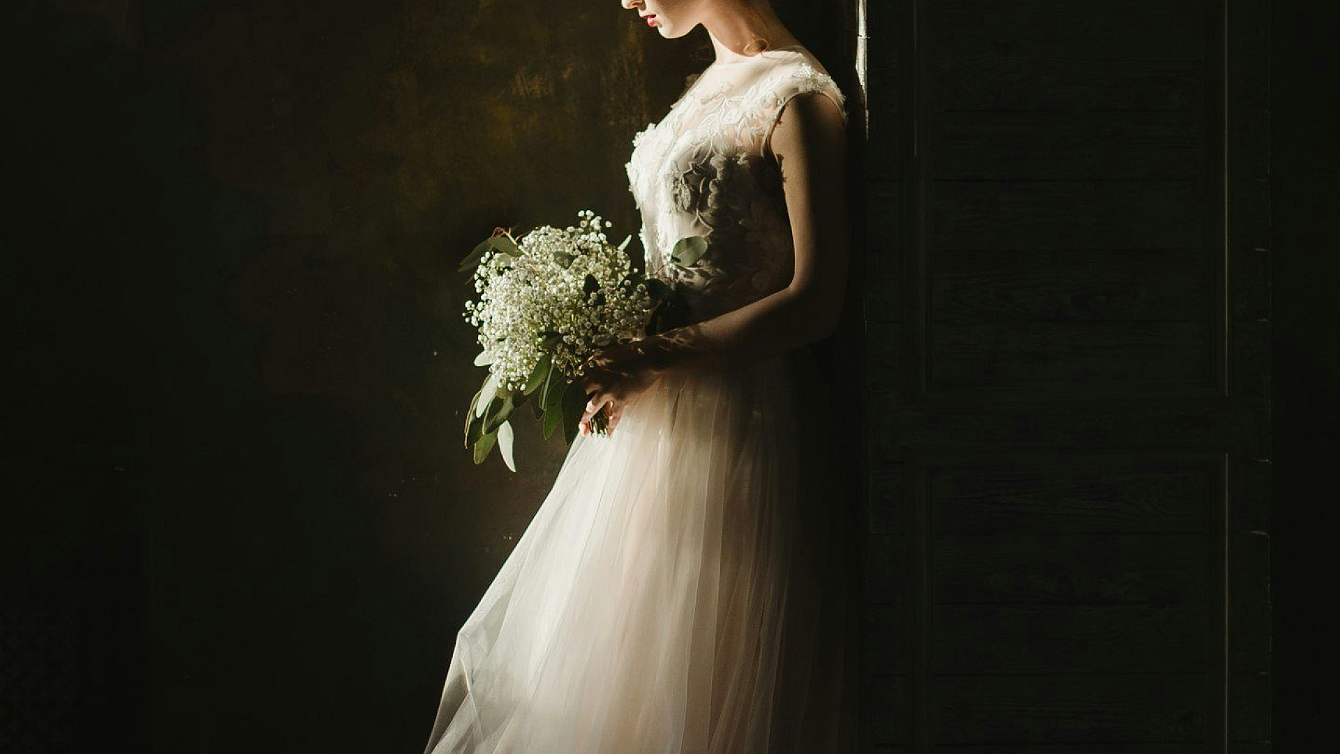 This wallpaper features a stunning woman in a breathtaking white wedding gown. She holds a beautiful bouquet of flowers, adding to the elegance of the scene. The image is perfect for those who appreciate bridal themes, marriage, and ceremony imagery.