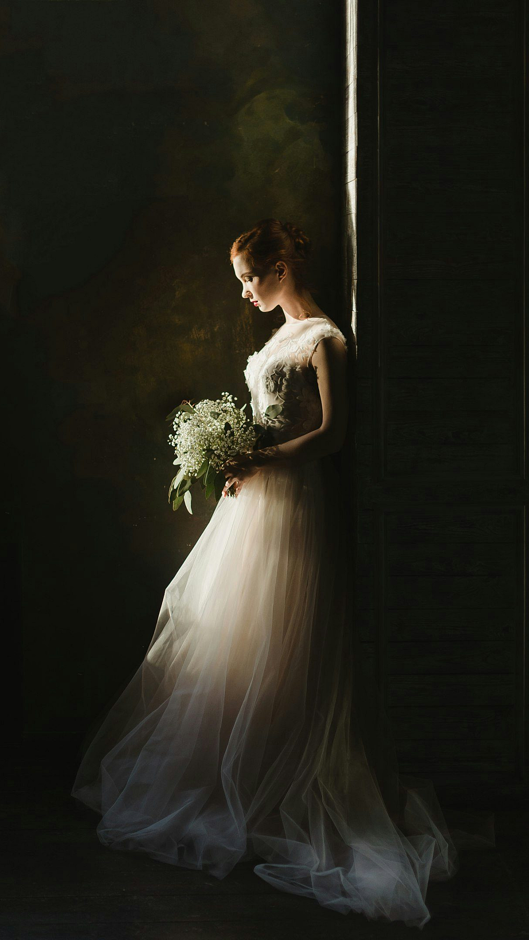 The dress is exquisitely detailed, and the overall composition is both beautiful and elegant. This wallpaper would be a perfect addition to any device, bringing a touch of romantic charm to your screen. The image is a portrait style, focusing on the bride and her floral arrangement.