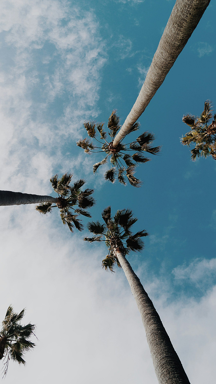 This wallpaper features a stunning worms eye view photograph of majestic coconut trees. The image captures the impressive height and detail of the trees, showcasing their lush leaves against a vibrant sky. The unique perspective offers a fresh and captivating view of this iconic tropical scenery.